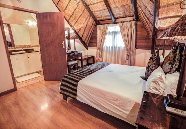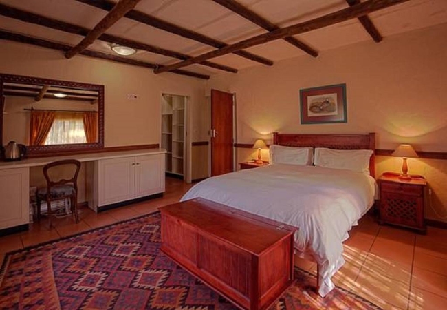 The Queen Room is furnished with a Queen-size bed. The en-suite bathroom is equipped with a shower, hand basins and WC. Room facilities include a coffee station, internet access and TV with DStv. Secure, covered parking is provided and there is both a breakfast area and family restaurant on site. Shuttles and tours can be arranged on request.