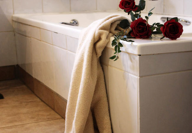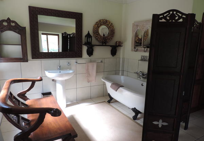 This romantic room has an open plan bathroom (Victorian bath) with separate toilet. Enjoy a drink or take a bath while watching the flames in the fireplace. A Queen-size sleigh bed is screened from the bath. A balcony is overlooking the pretty garden.