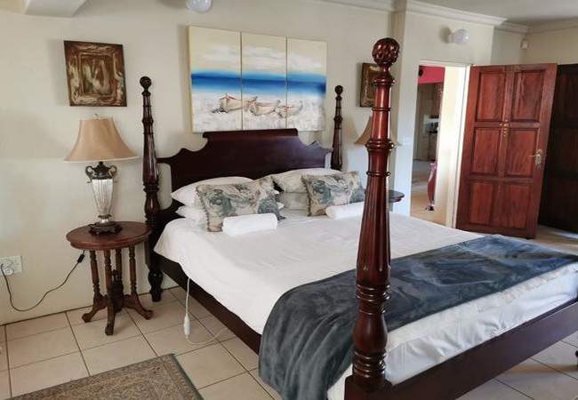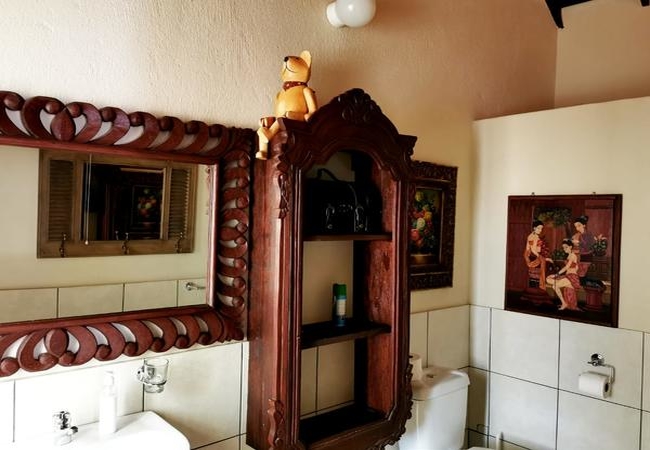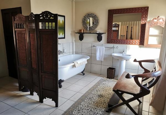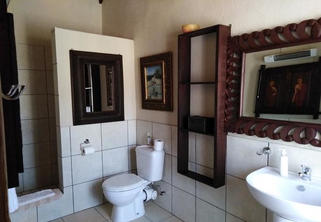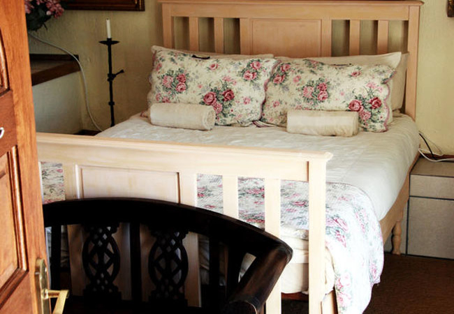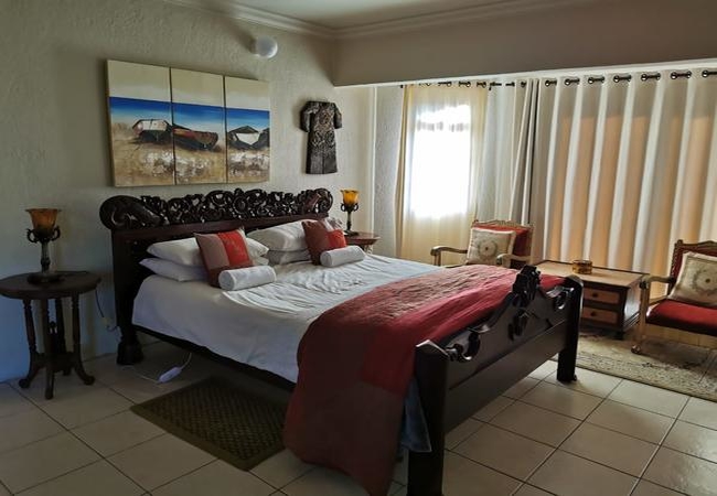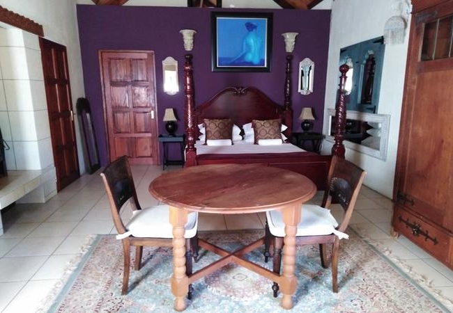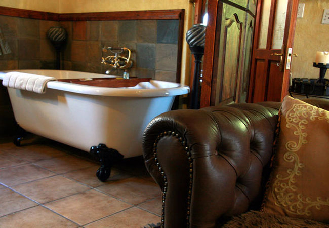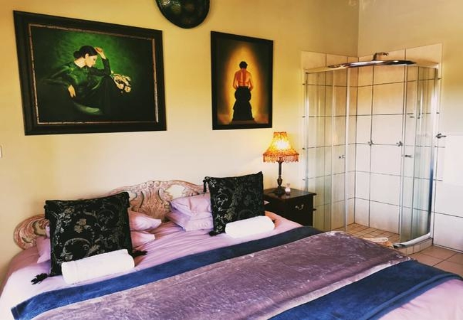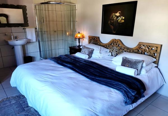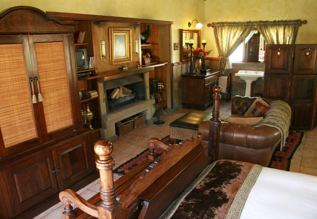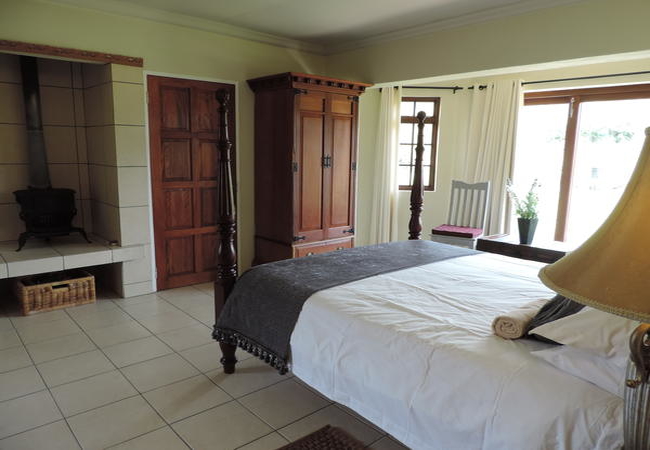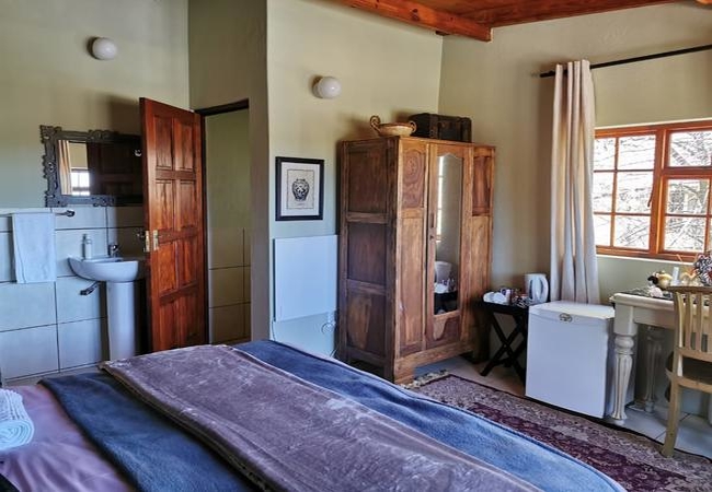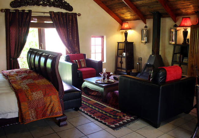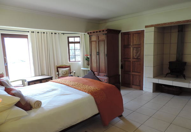 Beautifully decorated, with attention to detail. This large room is furnished with a Queen-size bed and an en-suite bathroom fitted with a shower, basin and separate toilet. The room has a living area with a fireplace, kitchen and outdoor braai area. and kitchenette.