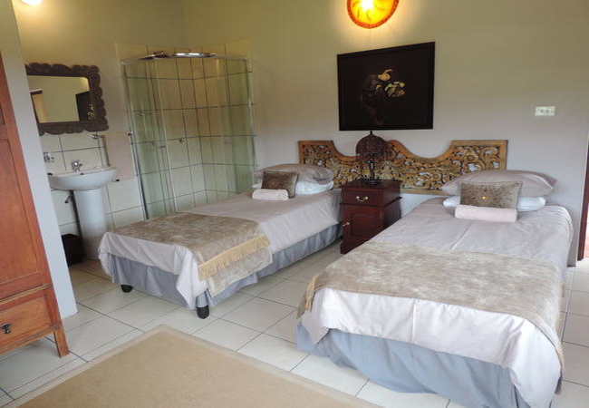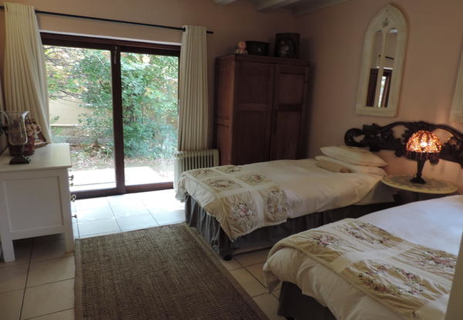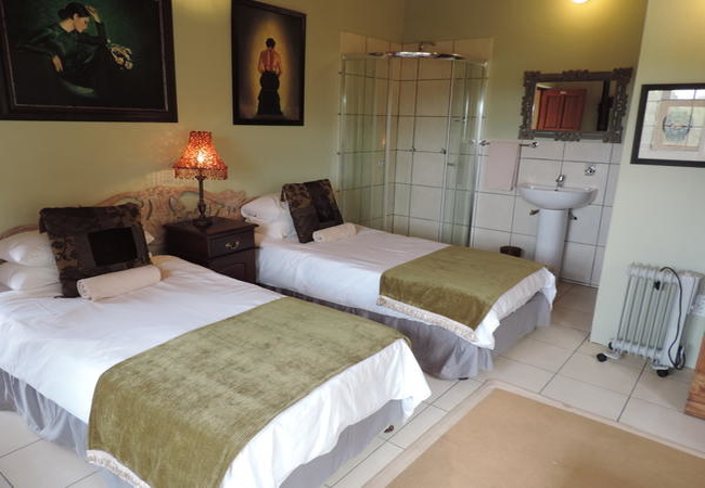 Beautifully decorated, with attention to detail. This room is furnished with two single beds and an en-suite bathroom fitted with a shower, basin and separate toilet. The room has a living area with a fireplace, kitchen and outdoor braai area. and kitchenette.