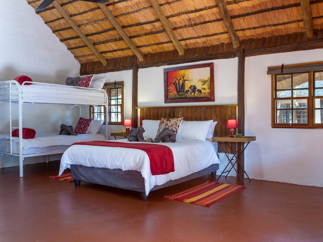 The family-friendly thatched room is ideal for small groups or families, featuring a double bed and an adult-size bunk bed. It includes an en-suite bathroom with a shower, as well as access to a private outdoor shower. The unit is equipped with air conditioning, a desk, a hairdryer, tea and coffee-making facilities, and complimentary Wi-Fi. Guests can also enjoy a sitting area, cleaning service, converters or voltage adaptors, and essential bathroom amenities. With views of the garden, each room also includes a bar fridge, a patio or balcony, and is designated as non-smoking for added comfort.