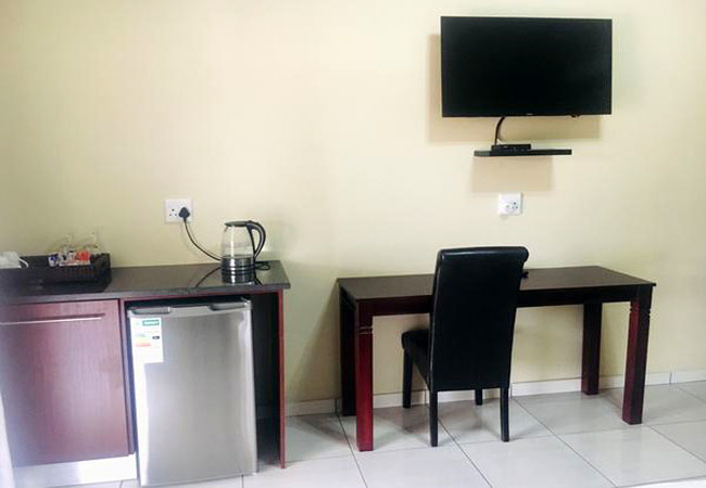 Kudu Room consists of one bedroom with a King-size bed and an en-suite bathroom with a shower and a bath. The bedroom is facing the garden and swimming pool. There is a study table and a dining space. Each room has a TV with DStv / satellite channels, a bar fridge, hairdryer, Wi-Fi and some units have fully equipped kitchens. Guests can make use of the swimming pool and free Wi-Fi.
