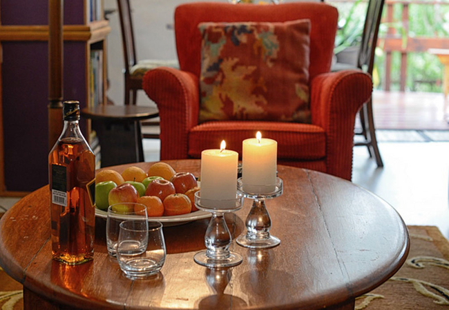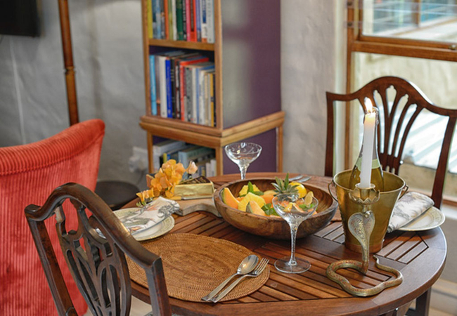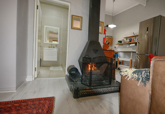 The lounge has comfortable couches and a wall-mounted flatscreen smart TV with full package DStv. Additional house features include a 2-seater dining table, indoor wood-burning fireplace, fully equipped kitchenette and uncapped Wi-Fi.