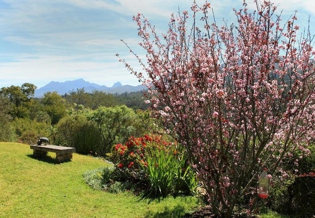 Fynbos Garden Cottage is open-plan and is furnished with a King-size bed and a single bed, accommodating up to three guests very comfortably. The en-suite bathroom is fitted with a modern walk-in shower, toilet and basin. The lounge has comfortable couches and a wall-mounted flatscreen smart TV with full package DStv. Additional house features include a 2-seater dining table, indoor wood-burning fireplace, fully equipped kitchenette and uncapped Wi-Fi. Outdoors offers a private patio with seating arrangements and built-in BBQ/Braai, also a private access from your designated parking bay. There is an additional bush lapa with seating arrangements and built-in boma BBQ/Braai situated in the lush gardens, for exclusive use by guests. The Cottage boasts garden, forest and mountain views. Basic cleaning is included once a week. Additional cleaning available upon request. There is a communal swimming pool which guests may make use of, also nature walks on the property.