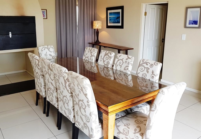 The living area is spacious and has a large corner couch and a flat screen TV with hotel bouquet DStv. The dining room seats ten guests. The house is also equipped with an indoor built-in braai in a separate braai room.