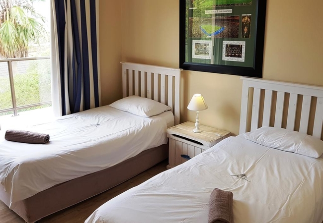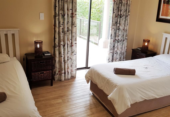 Galico House sleeps up to ten guests in five bedrooms. The main and the second bedroom each have a double bed with an en-suite bathroom that contains a bath and a shower. The third bedroom has a two single beds and also has its own separate bathroom with a bath and a shower. The fourth bedroom has a double bed and the fifth bedroom has two single beds and these bedrooms make use of a separate bathroom with a corner bath. Linen and bath towels are provided. The living area is spacious and has a large corner couch and a flat screen TV with hotel bouquet DStv. The dining room seats ten guests. The house is also equipped with an indoor built-in braai in a separate braai room. The kitchen is modern and fully equipped with everything required for a comfortable stay including a dishwasher and a washing machine. There is a garden area and outside on the patio there is a built in braai and a table with chairs with a view of the lagoon.