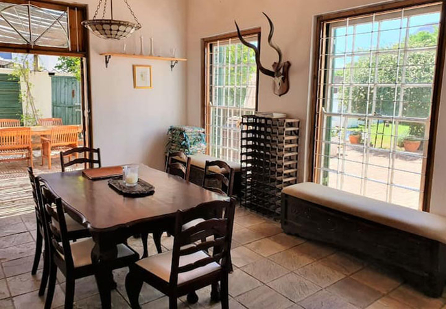 Newly restored classic Graaff Reinet home in the horseshoe of town, with yellowwood floors, high ceilings and thick walls. The house has four bedrooms. Two rooms have Queen-size beds and one has a double bed. The rooms have en-suite bathrooms. Two of the bathrooms have a shower and the other has a bath. There is an additional bedroom with twin beds. The kitchen is fully equipped and includes a dishwasher. The living area has a fireplace and free Wi-Fi is available. The home has a large dining room and a terrace outside with braai facilities. The beautifully maintained garden has a plunge pool and there is secure parking for one vehicle. Please note that it is a refurbished, historical building which has quirks, such as having to take two steps through the old stable garage to the bathroom off one of the bedrooms.