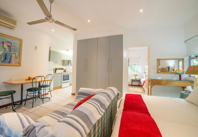 The studios are tastefully furnished, self-catering modern apartments, and overlook the gardens. Each studio is furnished with twin / two single beds. There is a kitchenette with a microwave, a fridge, a kettle and toaster, a sink, cutlery and crockery, and glassware. The studio is equipped with a TV, a telephone, a digital safe, air-conditioning and heating, and is serviced daily.