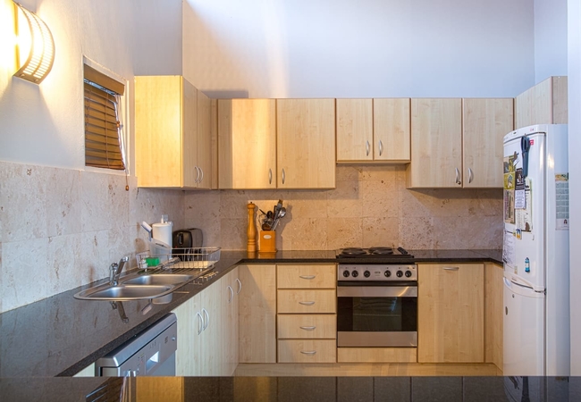The main living area is upstairs and leads onto a large balcony with full views across False Bay and the surrounding mountains. There is another living are downstairs and a large deck / sun roof accessible from the main balcony. There is a fully equipped kitchen with electric oven and hob, fridge / freezer, microwave and dishwasher.