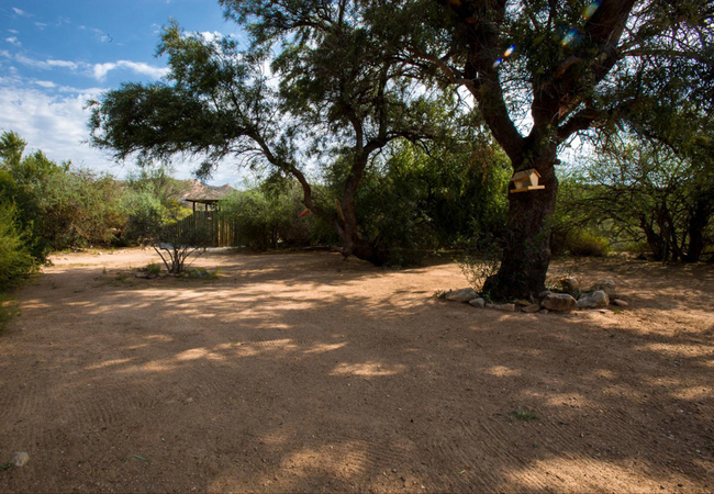 Your own natural bush lapa is private and close to the ablutions. Your vehicle is parked near to you and there is accommodation for two small or a large tent for four persons. Shade can be provided from your own awning or gazebo.