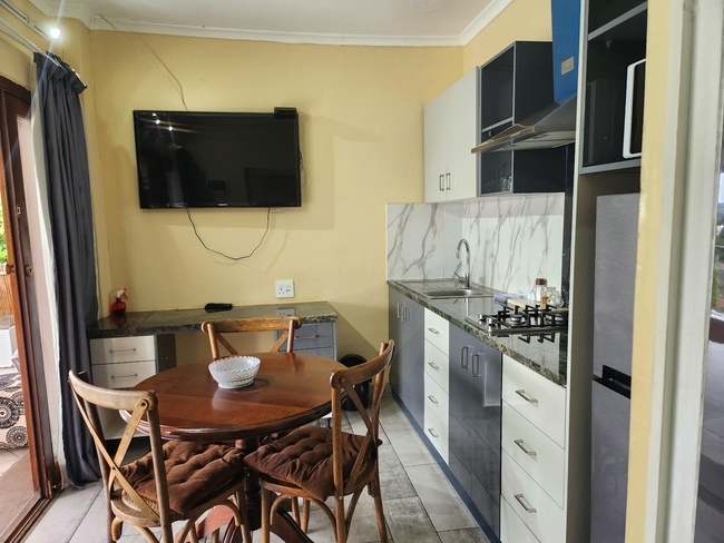 The open-plan unit is furnished with a King-size bed, a single bed and is equipped with an en-suite shower. The kitchen is fully equipped with a gas stove and dining area. The unit has a TV and Wi-Fi, opening to a shared patio with a braai area overlooking the pool.