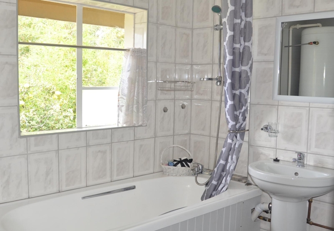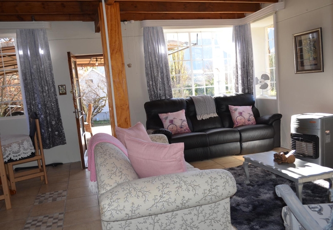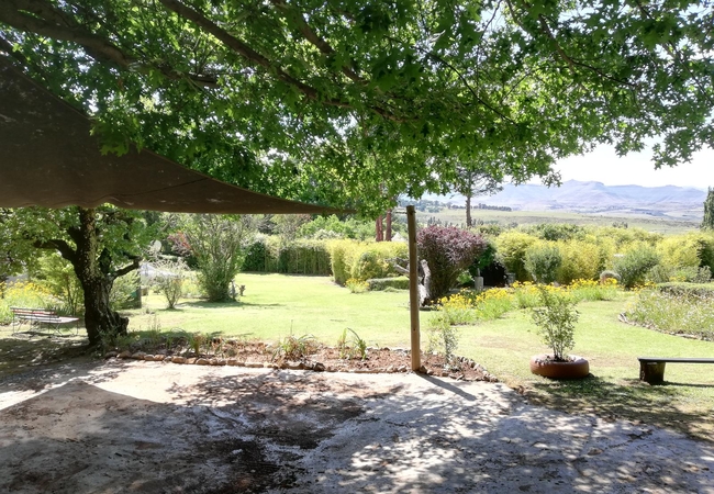The garden is large and shared with owner and other guests. Shaded parking is in the yard, behind locked gates. The covered patio has a large table and chairs where guests can make use of the braai and firepit or just enjoy the views of the garden and mountains.
