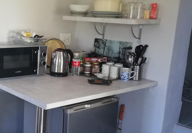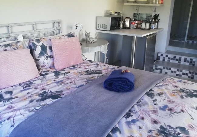 Cottage 2 is an open plan cottage. The bedroom area is furnished with a double bed and has a bathroom fitted with a walk-in shower, toilet and basin. There is a well equipped kitchenette (no stove). You will enjoy garden and mountain views from the bed and patio where there is a built in braai and outdoor dining.