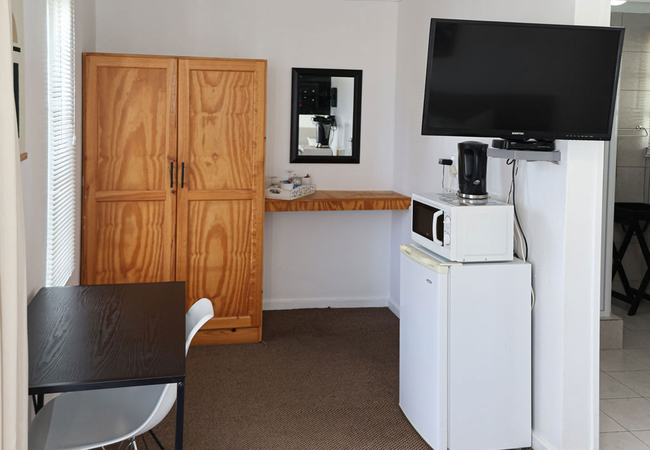 This Family Room is furnished with a double bed only. The en-suite bathroom is equipped with a shower, hand basin and WC. Equipped with DStv Hotel bouquet, kettle, telephone, heater, hairdryer, free Wi-Fi, tea- and coffee-making facilities.