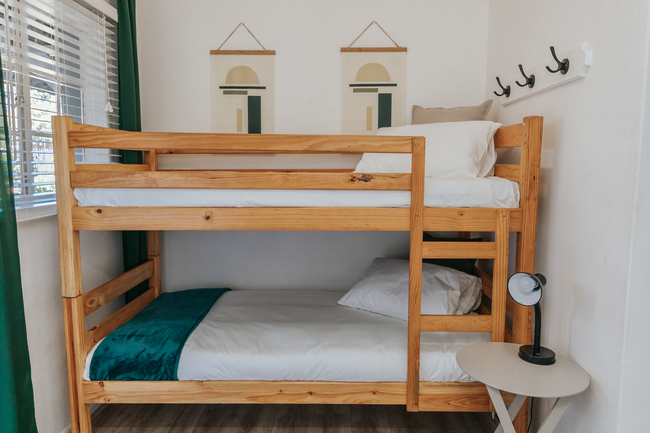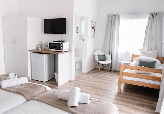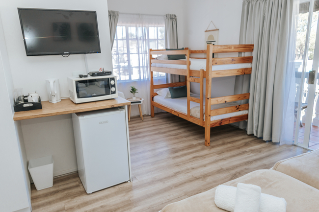 Family Room furnished with three single beds and a bunk bed, and a bathroom fitted with a bath, shower, toilet and basin. The room is equipped with a mini bar fridge, a microwave, kettle, tea / coffee, hair dryer, a TV with DSTV Hotel Bouquet and Wi-Fi.