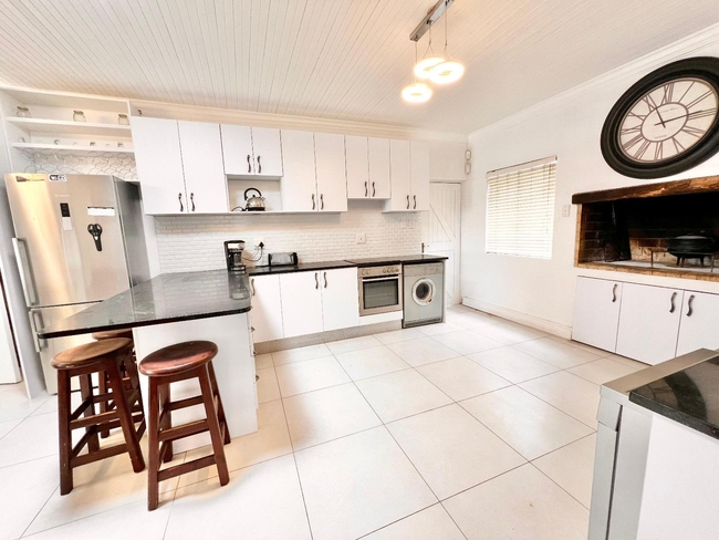 The fully equipped kitchen includes modern appliances such as a refrigerator, microwave, oven, dishwasher, washing machine, and tumble dryer, along with coffee and tea facilities. The indoor braai/fireplace enhances the homey atmosphere, perfect for cozy evenings.
