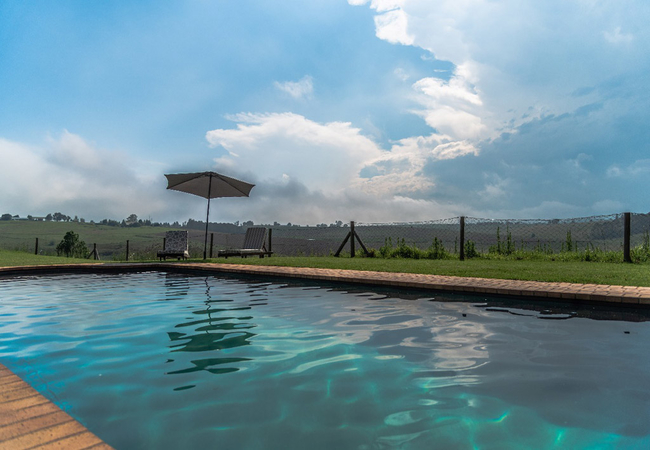 The apartment has two bedrooms. The main bedroom has a Queen-size bed and the second bedroom has two single beds. The first en-suite bathroom has a hand shower over the bath and the second en-suite has a shower. The well-equipped kitchen contains a fridge, a microwave, a gas stove and an oven. The adjacent open plan dining room and lounge has a wood-burning fireplace. There is a large verandah at the front of the unit and a private patio at the back. The veranda has a built-in braai area and boasts spectacular views of the Drakensberg Mountains and surrounding countryside. A communal swimming pool is available to guests.