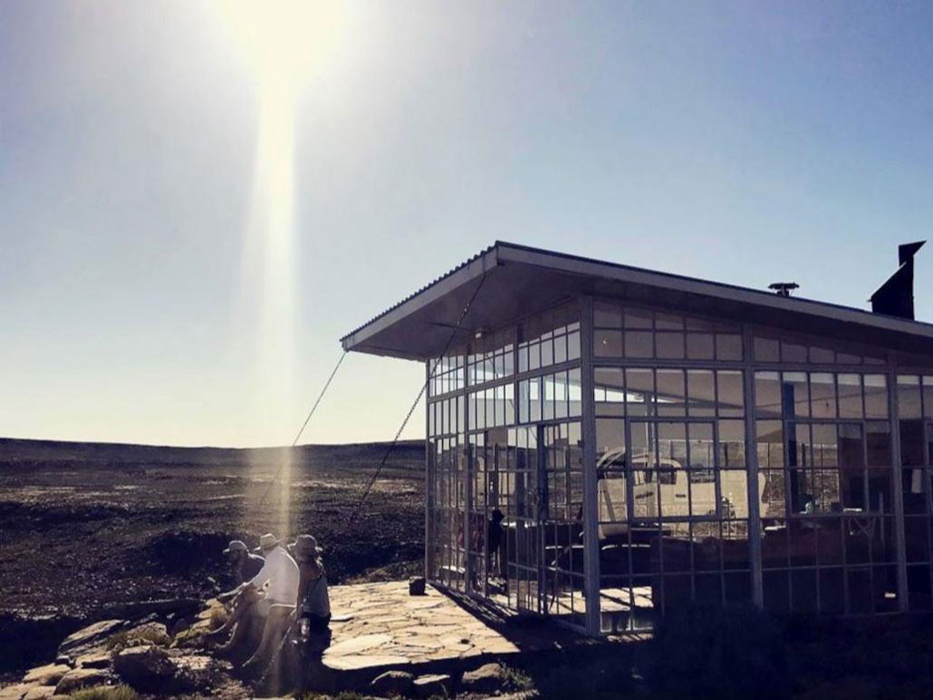 Glashuis is a chalet with vast windows and beautiful views of the valley. The accommodation is situated on Aarfontein Farm, a working sheep farm, between Fraserburg and Sutherland in the Northern Cape. The area is known for its snowy winters, and amazing stargazing opportunities.