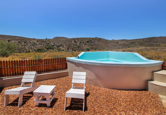 The three luxury cottages have private gardens complete with terrace, outdoor dining furniture, sun loungers as well as braai's and splash pools, ideal to cool down on a hot Karoo day. The rustic house has a fantastic stoop with a seating area and offers an amazing view and a garden with dining furniture and braai.