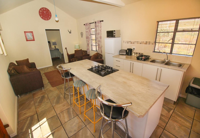 Fish Eagle Cottage has one bedroom which is furnished with a double bed. The bathroom is equipped with a shower, toilet and basin. The open-plan kitchen is equipped with a 4-plate gas stove, an electric oven, microwave, fridge-freezer, coffee- and tea-making facilities, crockery and cutlery. There are also an open-plan dining room and lounge area. It has a private garden with a terrace, dining furniture, braai facilities and a splash pool.