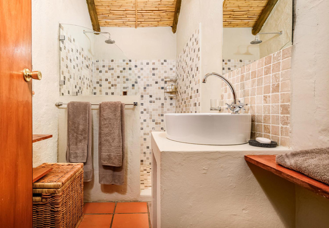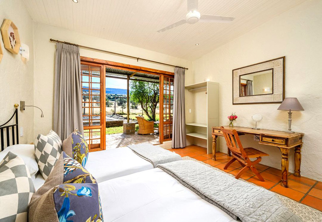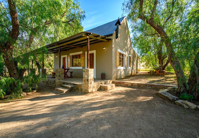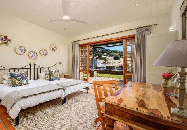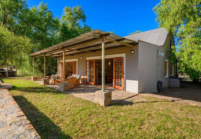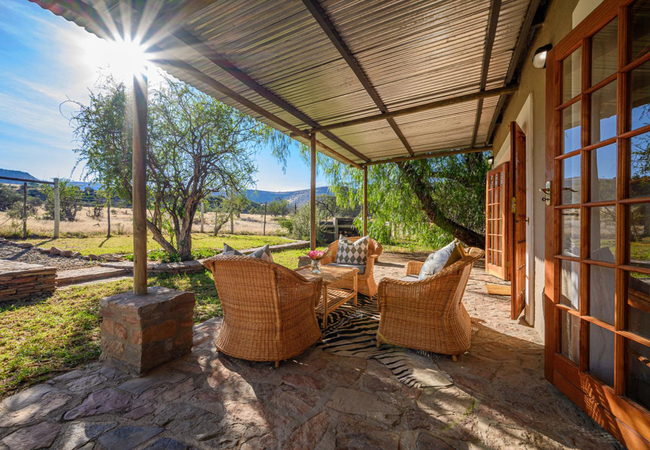 Pepper Tree Cottage is our beautiful self-catering cottage. This comfortable little cottage has two bedrooms with Twin/King beds, sleeping four guests in total. The bathroom has a bath and shower.It has a fully equipped kitchen, a small lounge area, fireplace, outdoor braai area, plunge pool and a stunning view.
