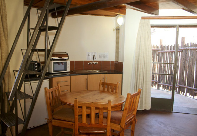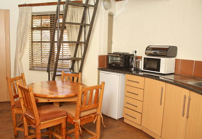 These rondawels are furnished with a double bed and an en-suite bathroom with a shower. The rondawels have an upstairs loft room with two single beds. Each rondawel contains a 4-seater dining table and chairs, and a kitchenette that is equipped with a bar fridge, 2-plate mini-stove and oven, kettle, toaster, and cutlery and crockery. There is also a private outside braai area with a table and chairs.