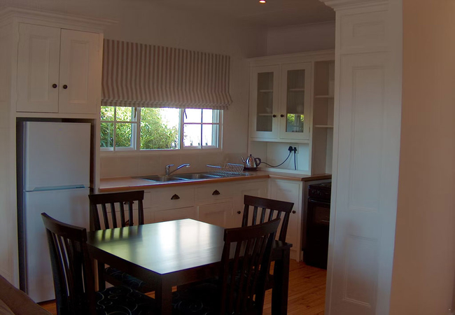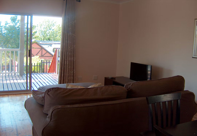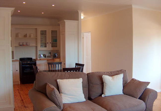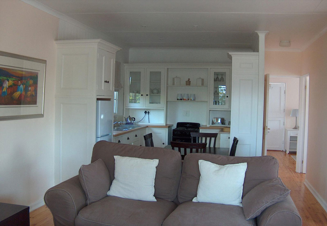 There is an open plan dining room, kitchenette, and lounge. The kitchen includes a fridge / freezer, microwave, stove and oven. There is a TV with DStv and Wi-Fi in the living area.