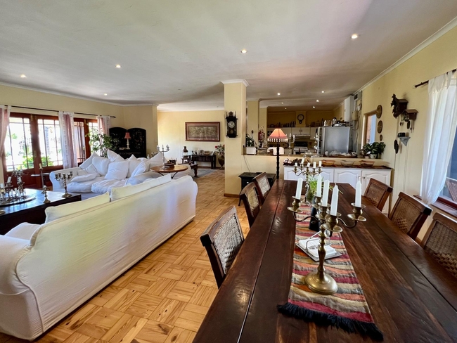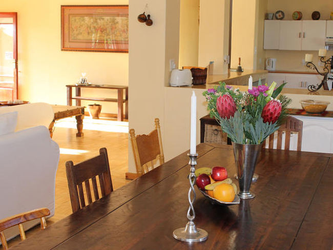 Open plan to the sitting room and dining area is the large pleasant farm style kitchen for self catering purposes, equipped with all you could need, giving a free flow for easy and relaxed socializing, whether in the kitchen, the sitting room or outdoors. The smell of home made rusks baking often fills the kitchen inviting guests to brew a cup of delicious filter coffee and dunk a rusk.. These are available to guests at all times.
