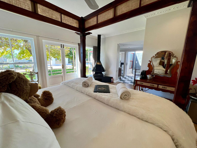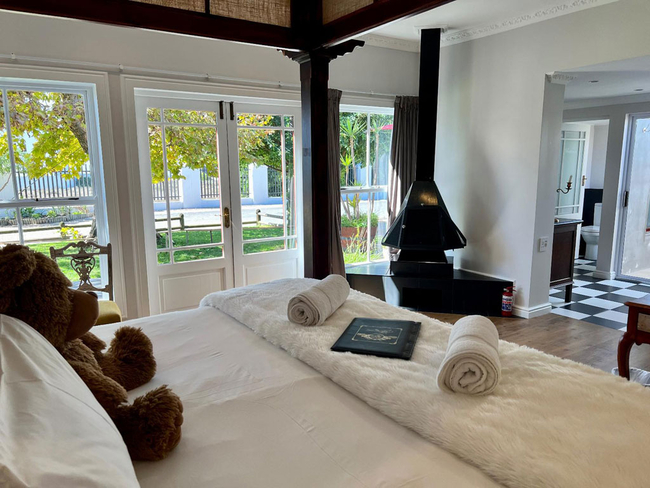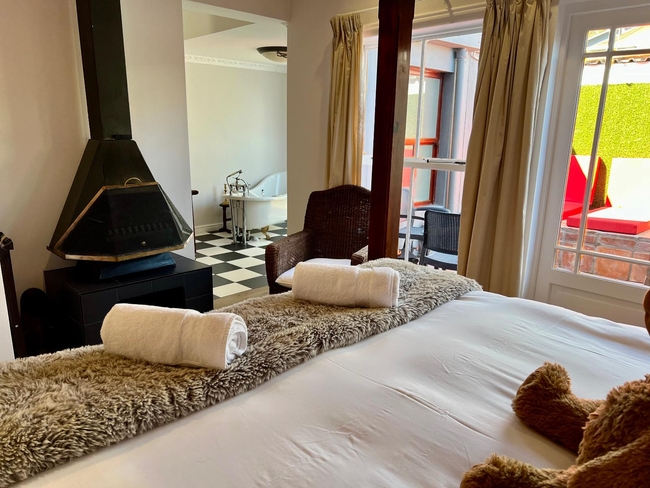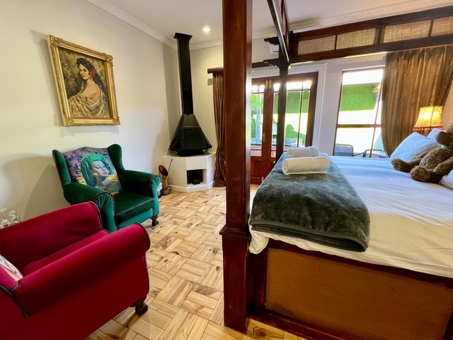 A delightful room with a queen-size four-poster bed and a log fireplace for cosy romantic evenings. Double doors lead onto a large veranda. A Victorian-style bath is well situated to view the sunrise.