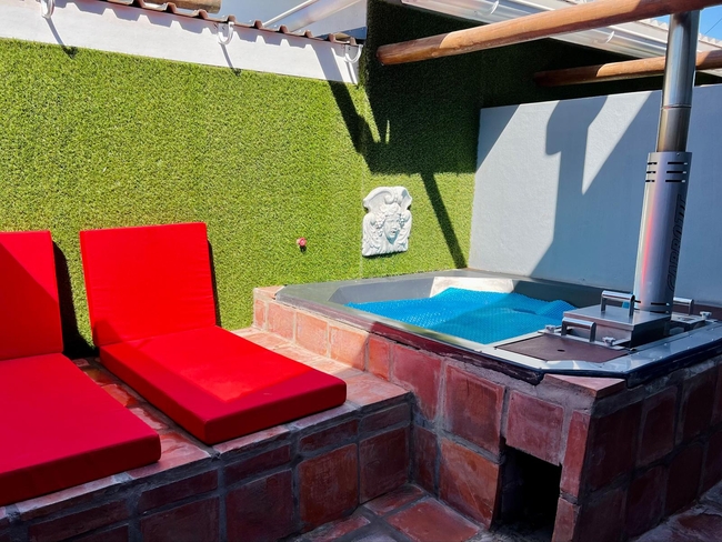 This beautiful room is furnished with a king-size four-poster bed and puffy white feather duvet. Double doors lead out into a lovely koi pond garden. The large Victotorian- style bath is big enough for two....