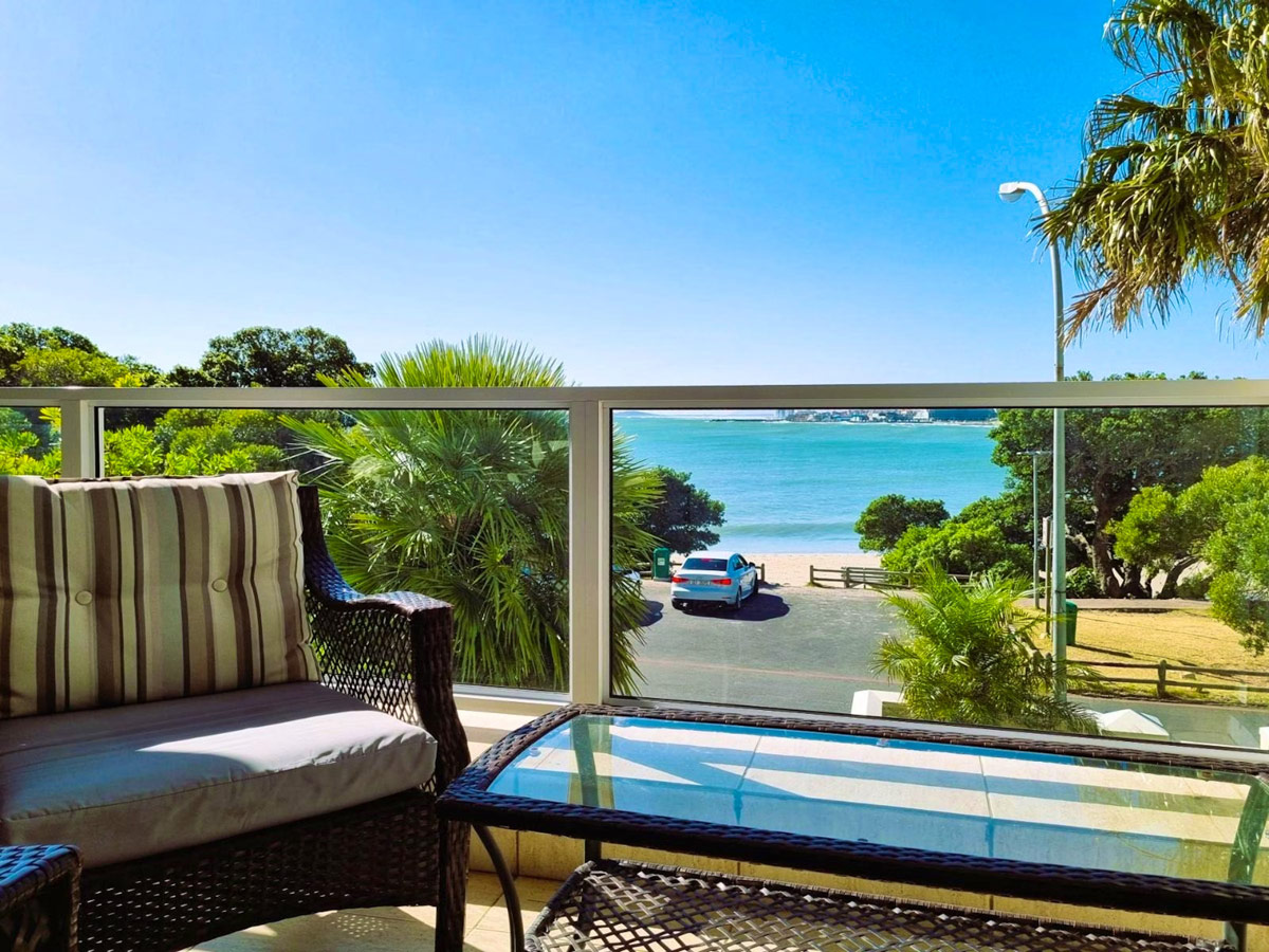Glass doors open from the lounge onto a private balcony, where outdoor seating provides a perfect vantage point for enjoying a sundowner while watching the waves.