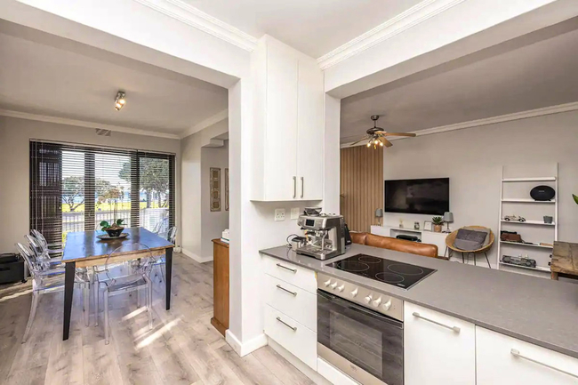Gone Coastal holiday apartment is designed to host up to four guests and comprises two well-appointed bedrooms and two bathrooms. Each bedroom is fitted with a double bed, offering restful comfort for a relaxing stay. The main bedroom is equipped with air-conditioning and a television for added convenience. The first bathroom contains a bathtub, while the second bathroom is fitted with a shower. Quality linen and bath towels are supplied for guests’ use. The open-plan layout creates an inviting living space that includes a modern kitchen equipped with a stove, oven, microwave, air fryer, fridge-freezer, coffee machine, and all essential cutlery and crockery. A washing machine and tumble dryer are provided to ensure ease during longer stays. The kitchen flows into a lounge area furnished with comfortable seating and a flat-screen TV, and guests can enjoy complimentary Wi-Fi throughout the apartment. A breakfast bar and a dining table provide ideal settings for shared meals. Sliding doors lead out onto a private balcony that features an outdoor dining area and a Weber braai, making it the perfect setting to unwind with a sundowner and take in the scenic surroundings.