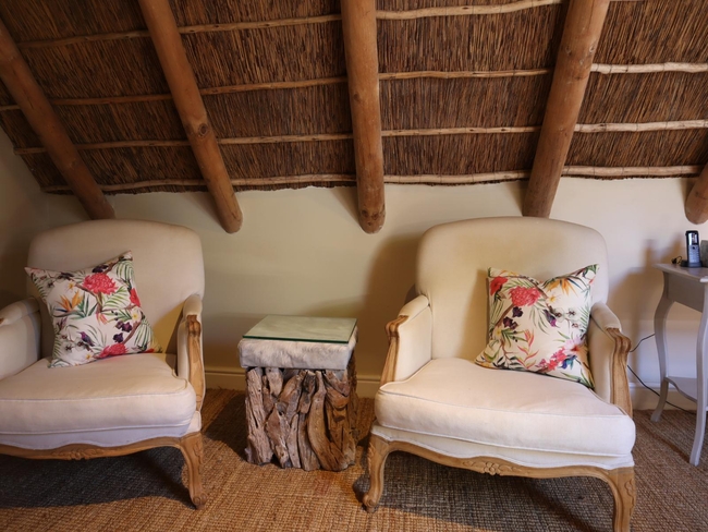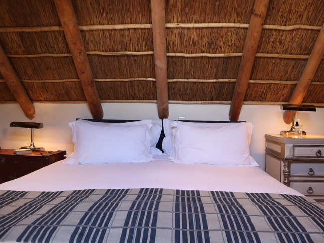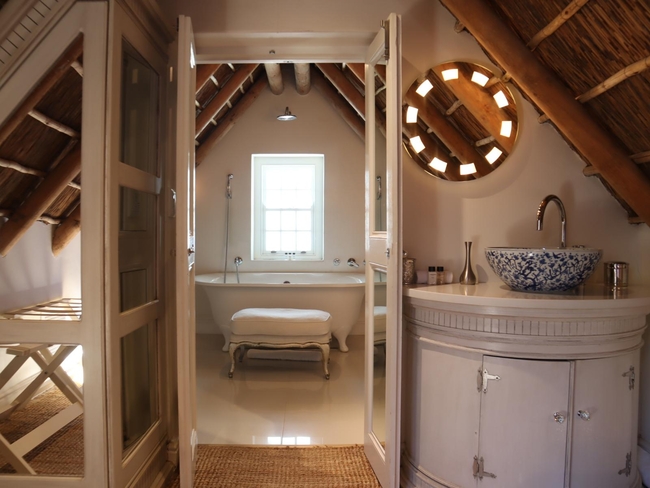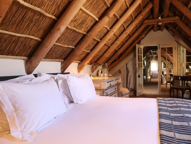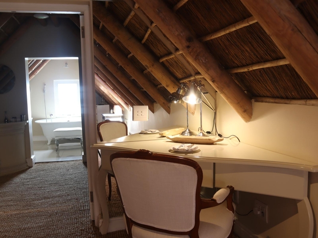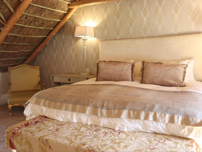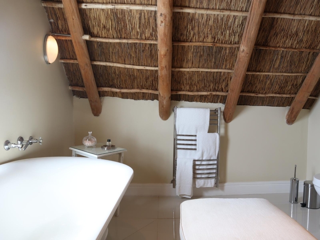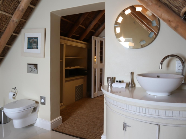 The Luxury Loft Room is furnished with an extra length King-size bed (please request twin beds if required). The en-suite bathroom is equipped with twin basin, bathtub with shower overhead and WC. It is under thatched roof, has air-conditioning, under floor heating, heated towel rails, hairdryer, tea and coffee tray, safe, telephone, wireless internet connection, i-pod dock.