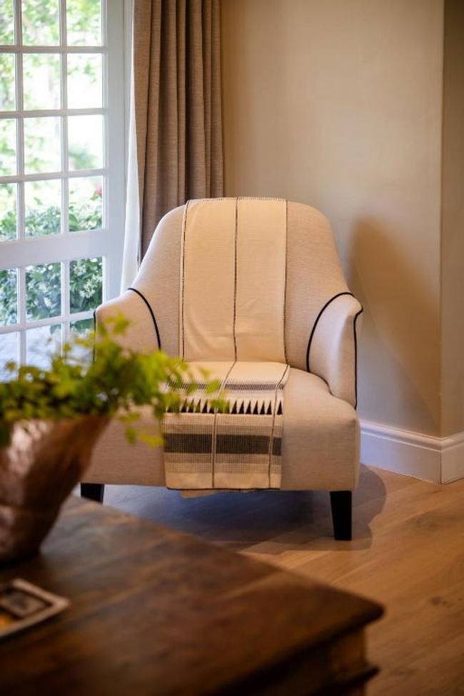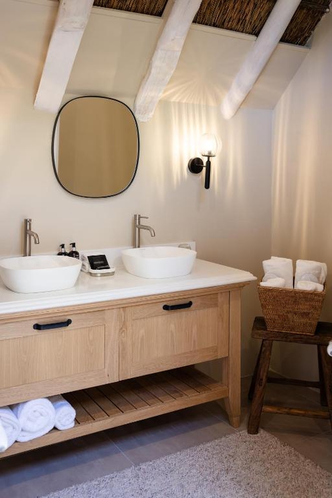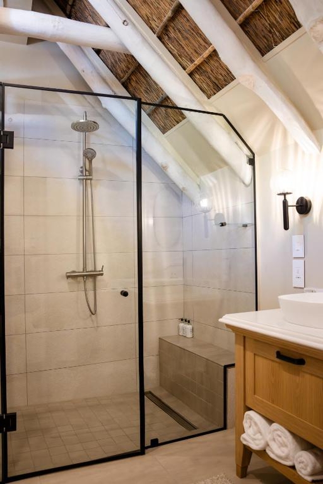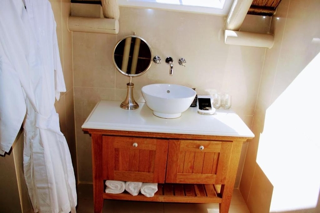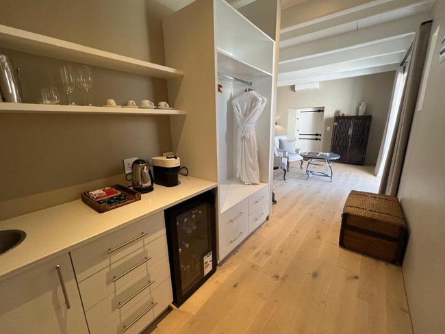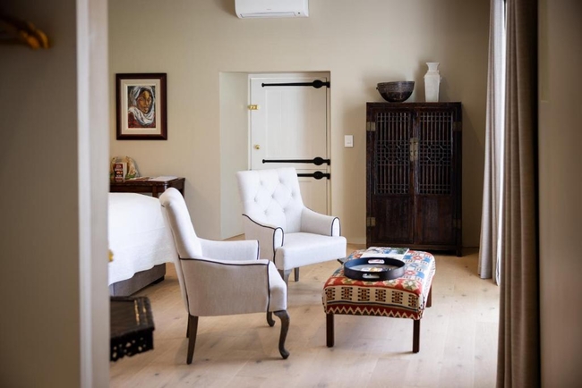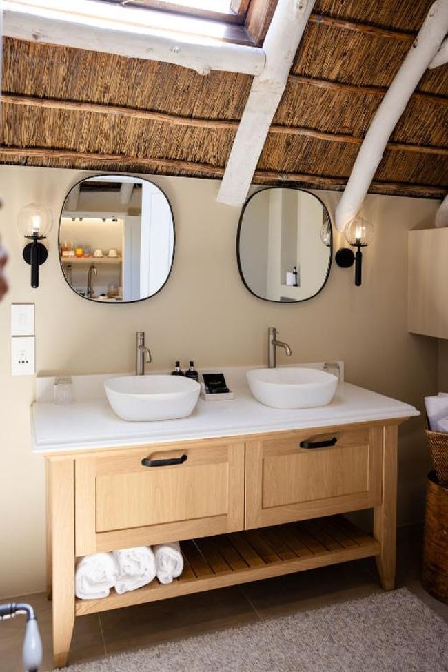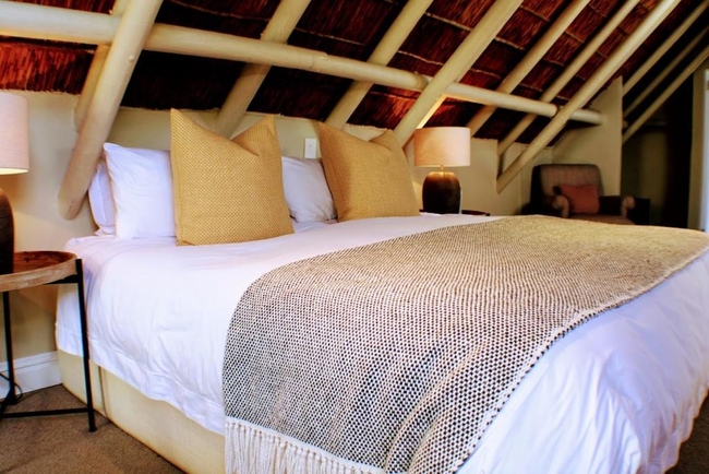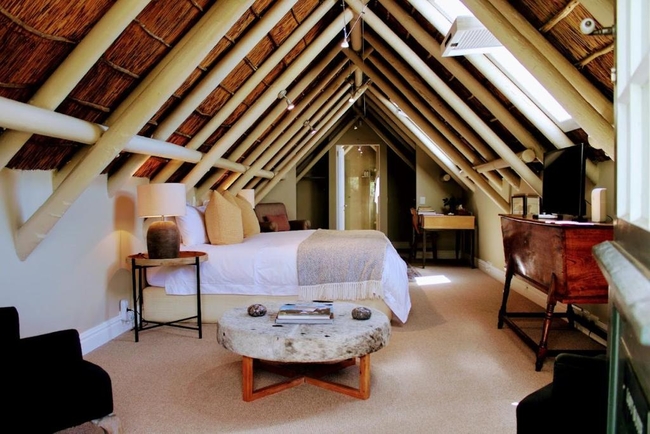 The Chardonnay Suite is an Industrial Chic Loft room with thatched roof, warm earthy feeling, luxurious bathroom and amenities. The room is furnished with a King-size bed dressed in 400 thread percale linen. Soft lighting. (Room size- 20 square metres), luxury en-suite bathroom equipped with a shower, bath, hand basins and toilet. Facilities include bathrobes, bathroom amenities, turn down service, wake-up calls, Coffee/Tea maker, air conditioning, complimentary high speed internet in room, slippers, converters/ Voltage adaptors, hairdryer, kitchenette, minibar, non-smoking, safe and sitting area.
