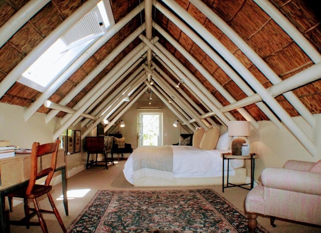 Outside, Rustic thatched Roof Loft suite furnished with a Queen-size bed and an en-suite bathroom fitted with a shower and bathtub, toilet and basin. Bathroom is fully equipped with bath amenities and a hairdryer. Balcony looks out over the vineyards. WIFI.
