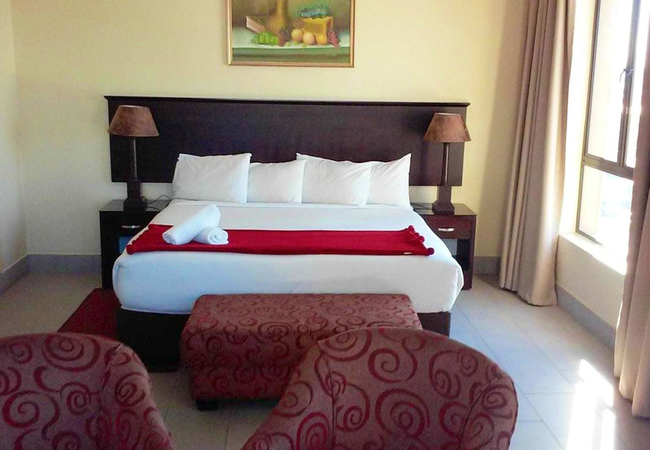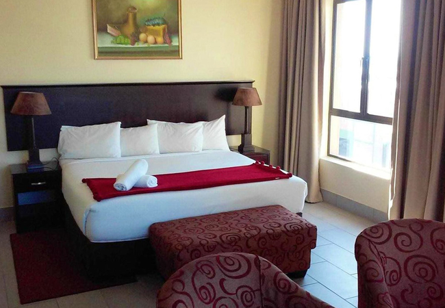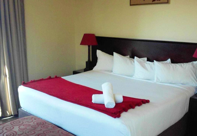 These rooms are situated on the ground floor of the hotel. They are furnished with a double bed and have an en-suite bathroom with a shower. DStv, a tea / coffee station, safe and fridge are provided.