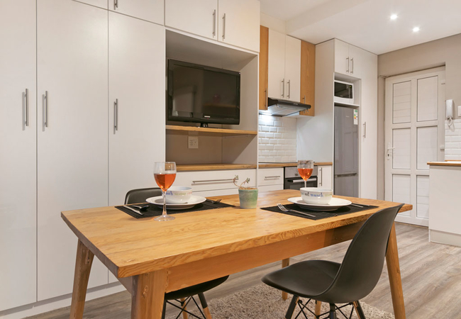 Greenpark Studio is an open plan studio apartment in Green Point. The main living area consists of a full kitchen for effortless self-catering, a cosy dining table that can also function as a workspace, ample cupboard space and a flat-screen TV with Wi-Fi and Netflix (accessible with your own log in details).