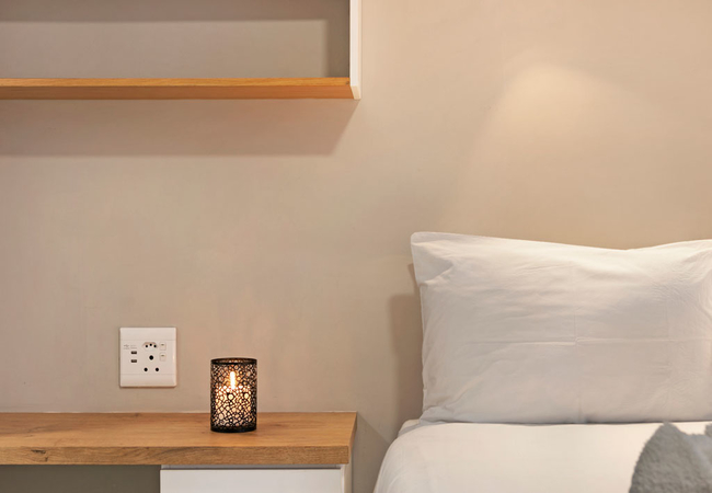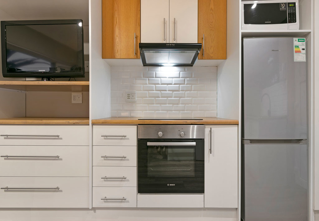 Greenpark Studio is an open plan studio apartment. The main living area consists of a full kitchen for effortless self-catering, a cosy dining table that can also function as a workspace, ample cupboard space and a flat-screen TV with Wi-Fi and Netflix (accessible with your own log in details). The apartment is furnished with a double bed and the en-suite bathroom is fitted with a large shower, toilet and single basin in a crisp white aesthetic with black accents for a modern space. A large floor to ceiling window adds something special, providing stunning views of the city lights below and plenty of natural light in the day.