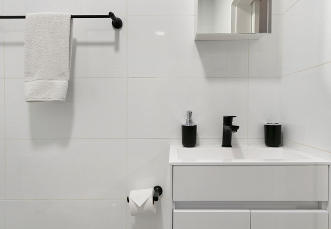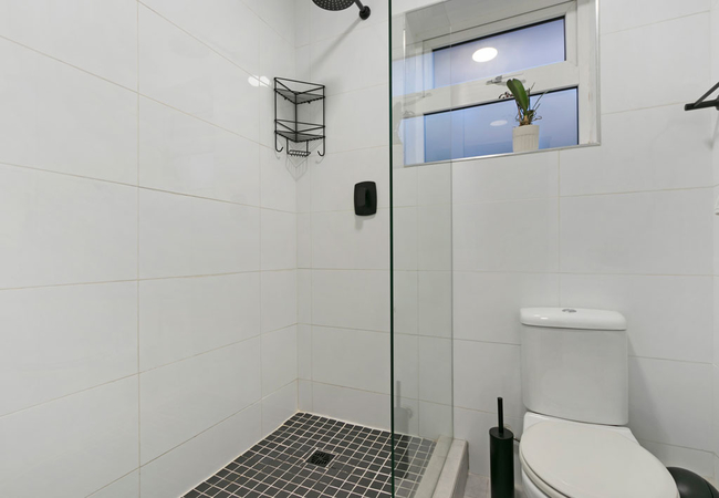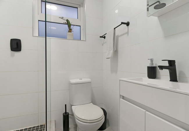 The apartment is furnished with a double bed and the en-suite bathroom is fitted with a large shower, toilet and single basin in a crisp white aesthetic with black accents for a modern space.