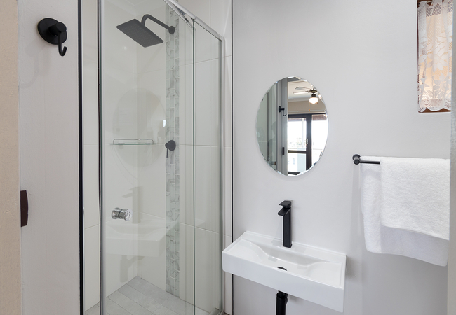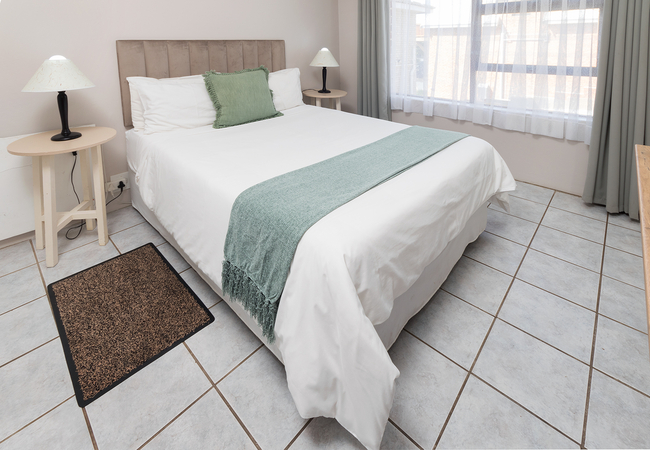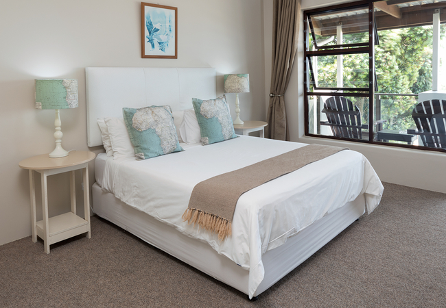 Deluxe Room 1 has a partial sea view and a balcony. The room is furnished with a Queen-size bed. The en-suite bathroom is equipped with a shower, hand basin and WC. The unit is located upstairs, no lift. Other facilities include TV with selected DSTV channels, Free Wi-Fi, desk, tea/coffee making facilities.
