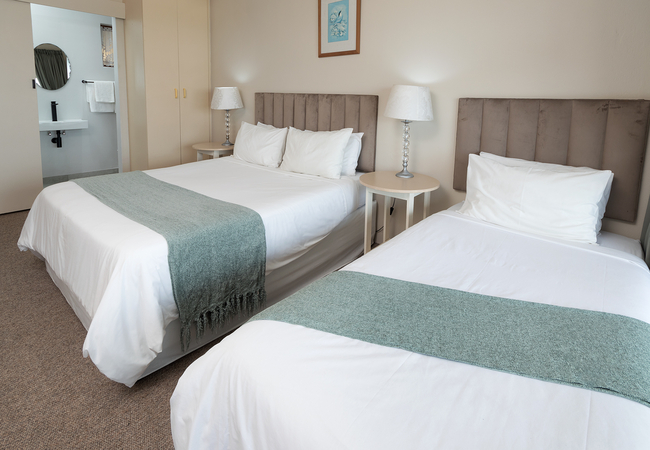 Deluxe Room 3 has a partial sea view and a balcony. The room is furnished with a Queen-size bed and a single bed. The en-suite bathroom is equipped with a shower, hand basin and WC. The unit is located upstairs, no lift. Other facilities include TV with selected DSTV channels, Free Wi-Fi, desk, tea/coffee making facilities.