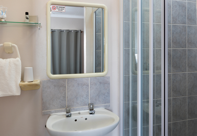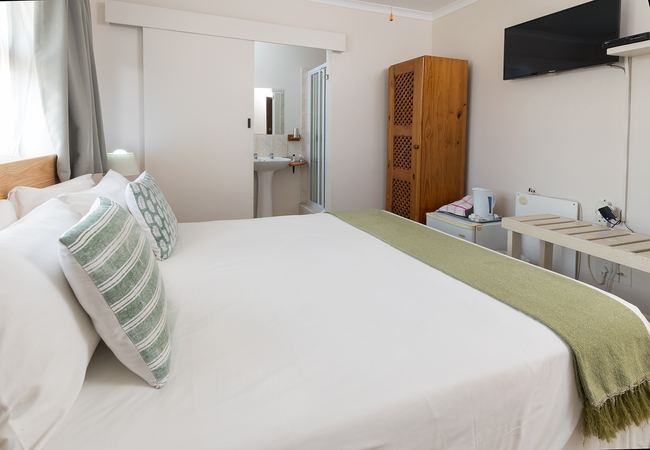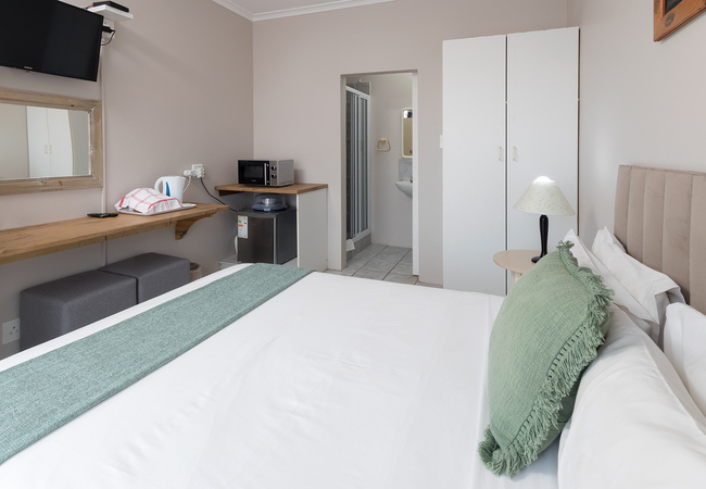 The Double Room is upstairs with no lift and is furnished with a double bed. The en-suite bathroom is equipped with a shower, hand basin and WC. Other facilities include TV with selected DSTV channels, Free Wi-Fi, fridge, tea and coffee making facilities.
