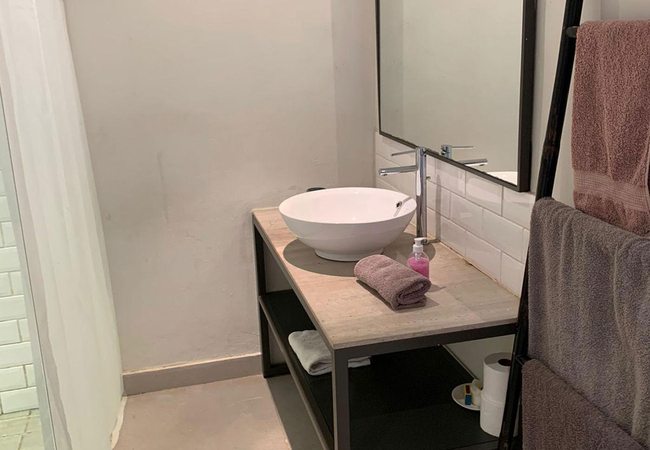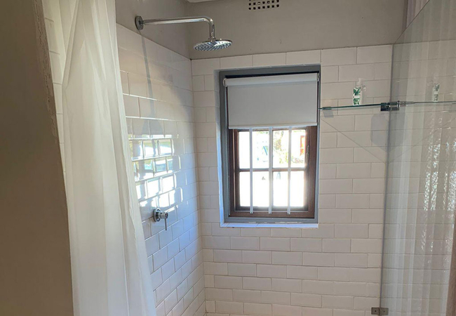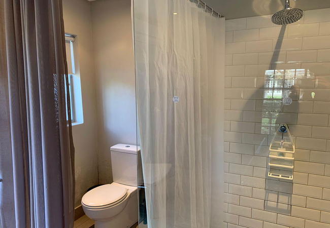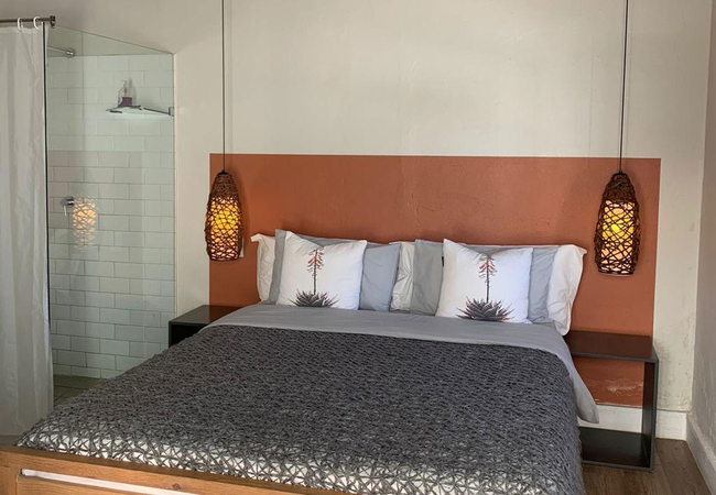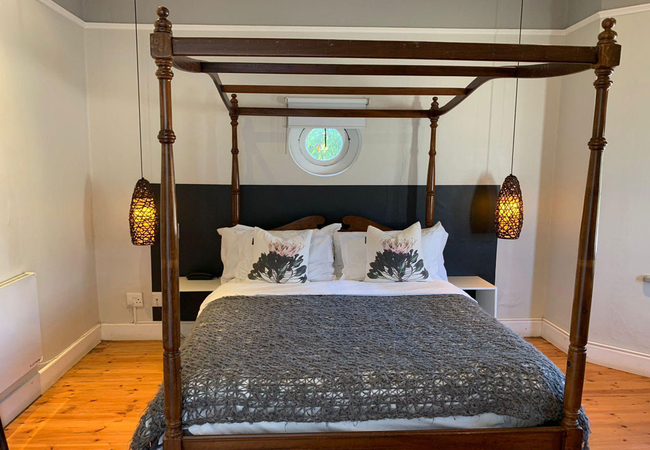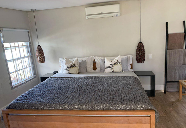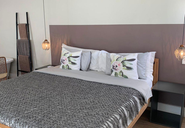 Garden Room 4 features solid timber roof beams. The room is furnished with a Queen-size bed and has an open plan en-suite shower. The room is equipped with a tea and coffee station, telephone, Wi-Fi, work desk for business travellers, wall heater and fan.