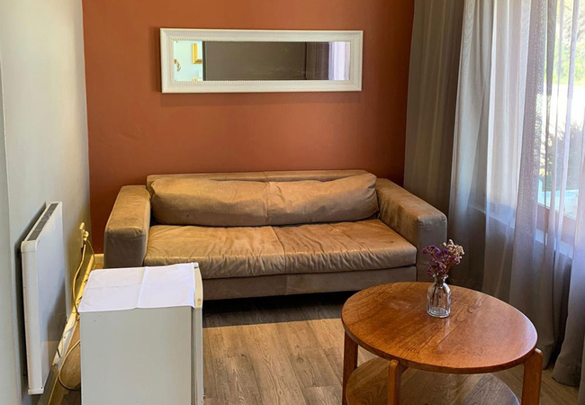 Garden Room 6 is furnished with a King-size bed and has an open-plan en-suite bathtub. The room is equipped with tea and coffee station, telephone, Wi-Fi, desk, lounge area, wall heater, fan and garden patio. This room can accommodate a single bed for one child under the age of eight.