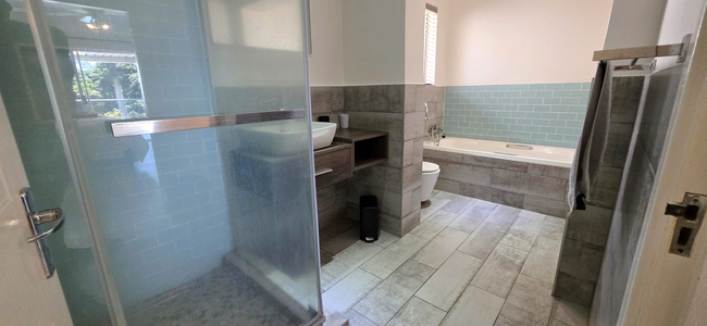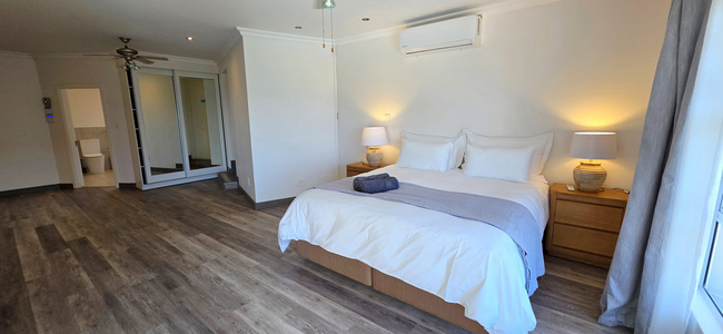 Guests can make full use of the spacious outdoor patio, which features a dining table and built-in braai area, ideal for al fresco meals. The private swimming pool is complemented by sun loungers, creating a relaxed outdoor setting. Secure parking is provided on the premises. Ramsgate Beach is located approximately 1.5 kilometres away, and a variety of shops and restaurants can be found nearby.