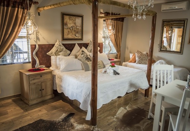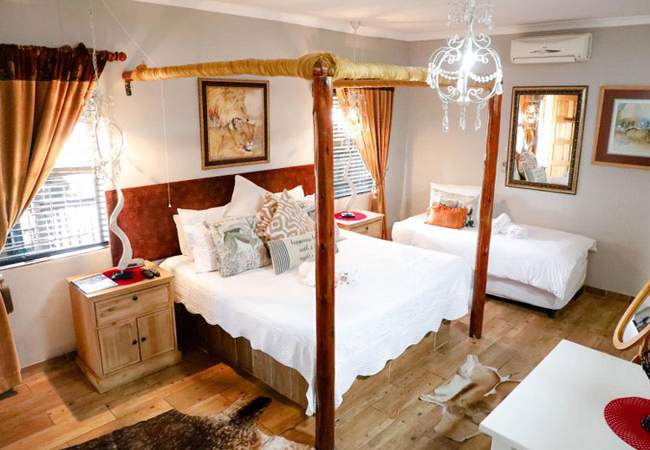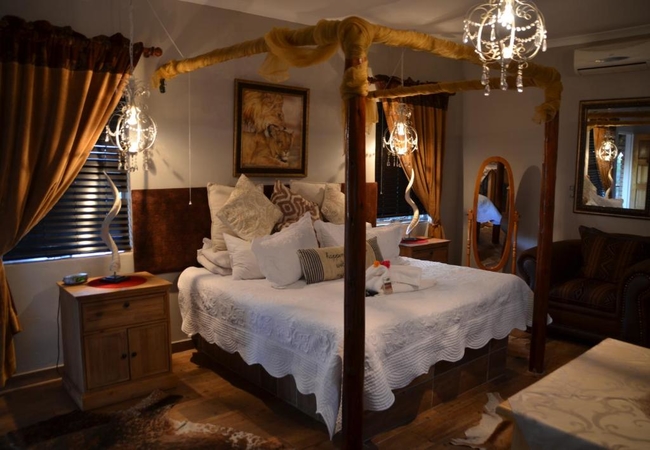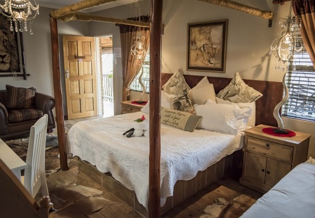 The lovely and luxuriously furnished Superior Executive Suite has a TV with DStv commercial, tea and coffee making facilities and an en-suite bathroom with overhead shower in a jacuzzi bath. A four poster bed dressed in beautiful linen and lots of extra luxuries. Each room has a TV with DStv, tea / coffee making facilities, a hairdryer, fan / heater, bed linen and bathroom towels.