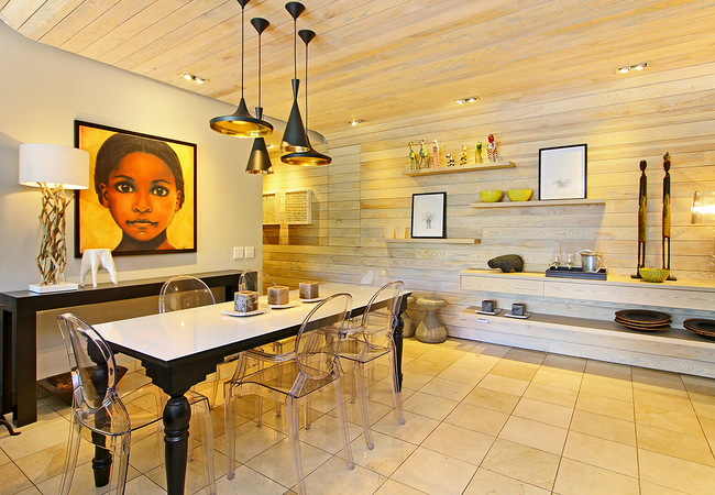 The entertainment and living area is super stylish with incredible features, décor, furniture and artwork. The lounge area has a corner couch, additional chairs and a TV with DStv and a DVD player. The dining area is positioned behind the lounge and is a lovely place to enjoy a romantic dinner. The kitchen has everything required for a comfortable self catering stay.