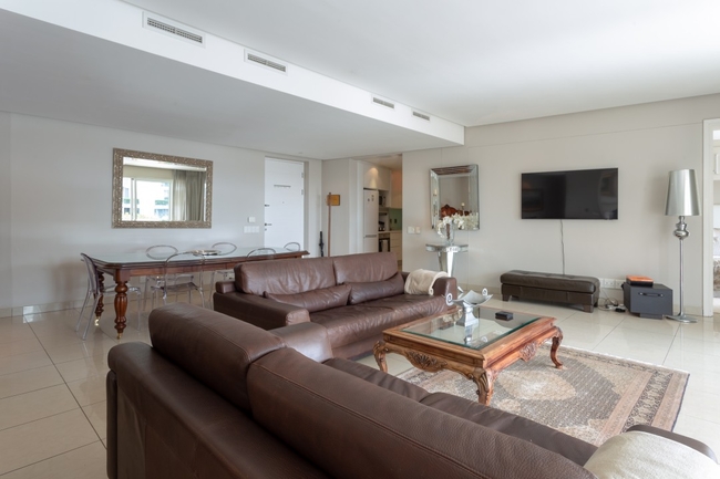 The apartment's rich leather decor and contemporary finishes provide a stylish yet comfortable environment, making it ideal for families or couples. Each bedroom boasts an en-suite bathroom and shares the same beautiful water views.