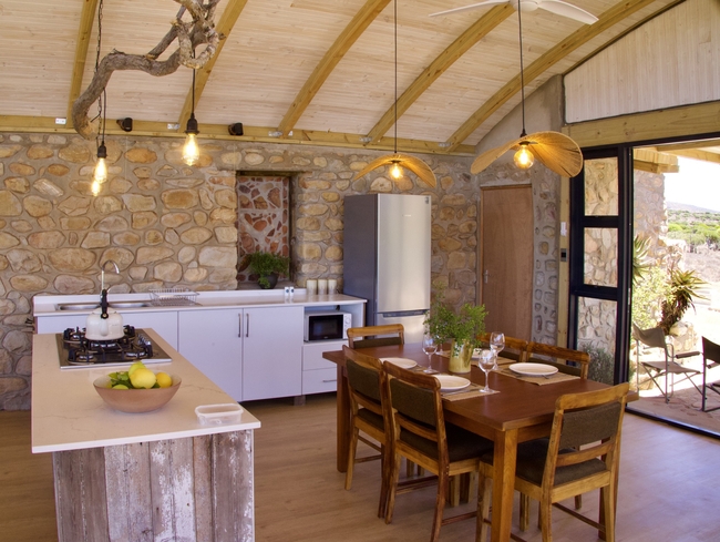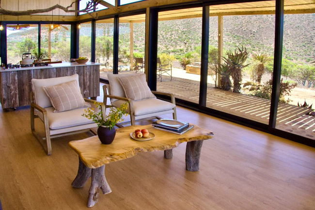 The open plan living space features a fully equipped modern kitchen with a fridge freezer, gas stove, microwave, cutlery, crockery, and tea and coffee making facilities, complemented by a central six seater dining table. The adjoining lounge offers generous and comfortable seating, and large glass sliding doors open onto sweeping 180 degree views of the Karoo landscape.