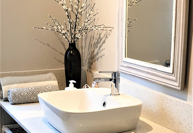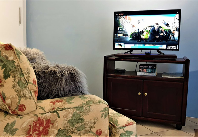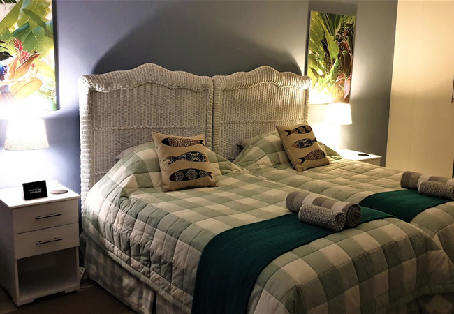 This unit is fitted with two three-quarter beds and has an en-suite bathroom (with a shower, toilet and a basin). There is a sitting area that is furnished with a sofa and a TV with Netflix. The semi equipped kitchenette consists of a bar fridge, microwave, glassware and tea / coffee making facilities. There is also an iron and ironing board.